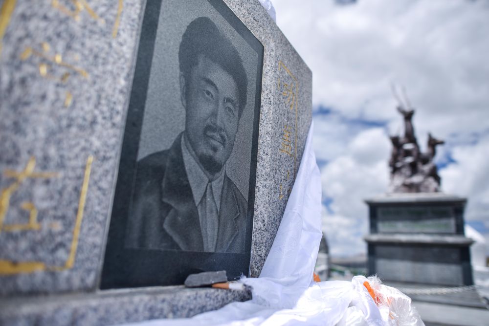 這座石碑鐫刻著杰?!に髂线_杰的名字。20多年前,為了保護瀕危的藏羚羊,他與盜獵分子槍戰(zhàn)到生命最后一刻,遺體被凍結成冰雕。