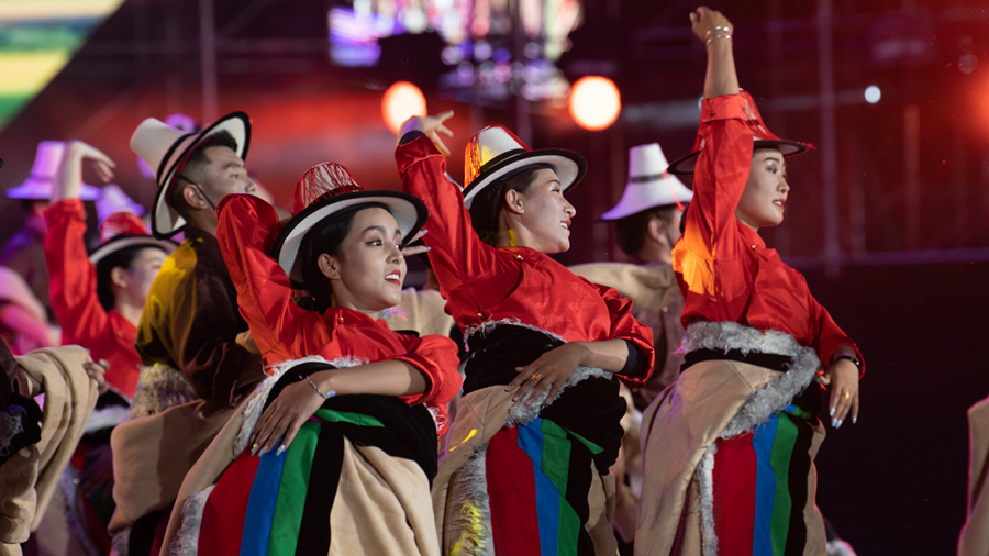 7月31日,慶祝青海省海南藏族自治州成立70周年藏族服飾藝術(shù)嘉年華迎賓晚會現(xiàn)場。