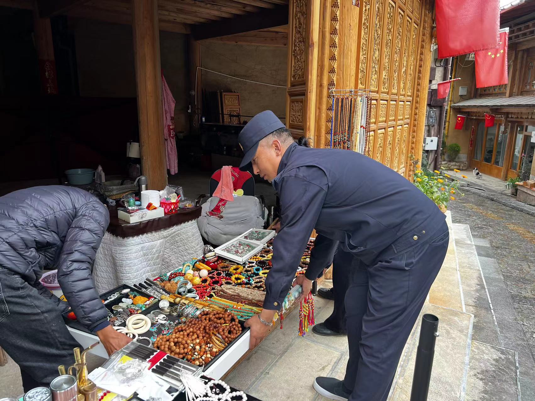 整治過程中,綜合行政執(zhí)法人員全天候無縫巡查,重點對出店經(jīng)營、占道經(jīng)營、亂停亂放、流動攤販無序擺攤等問題進(jìn)行整治。排查月光廣場等公共區(qū)域擺攤?cè)藛T,凡屬古城內(nèi)商戶的一律要求返回店內(nèi)買賣;屬于流動攤販的及時引導(dǎo)至劃定的攤位;對古城內(nèi)所有亂停亂放的機動車和非機動車,及時找到使用人,要求停放至指定區(qū)域,確保游客出行更加方便,市容更加整潔有序。圖為綜合行政執(zhí)法人員在勸導(dǎo)占道經(jīng)營攤點。