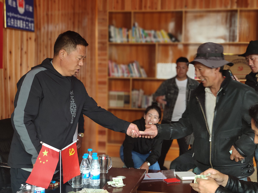“振業(yè)振興新征程 旺達村分紅大會”的橫幅在村活動中心會議室內(nèi)鮮艷顯眼,村民們興高采烈,早早地等候在這里領取分紅金?!敖衲炅鬓D費總計130000元,每戶可分紅5200元。”分紅儀式上,上木拉黨委書記格絨次乃向村民們介紹了旺達村房屋流轉、荒地收益情況和民宿產(chǎn)業(yè)下一步規(guī)劃。在場村民臉上無不洋溢著幸福的笑容,高興地鼓起了掌。