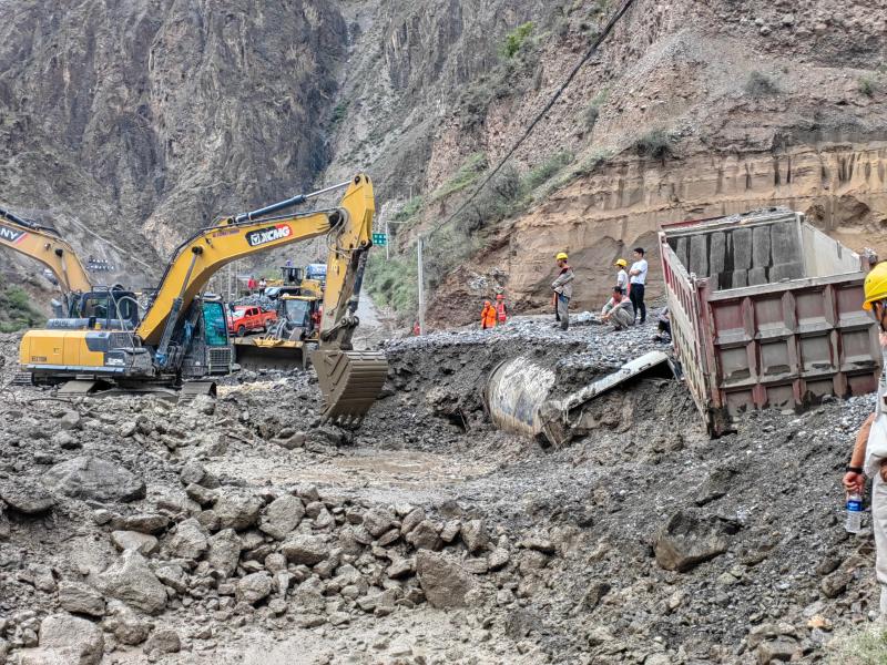 近日,受持續(xù)強降雨影響,G214線佛山鄉(xiāng)古水村附近K1911+750處發(fā)生泥石流災(zāi)害,造成交通中斷。德欽公路分局立即啟動汛期保通應(yīng)急預(yù)案,第一時間組織應(yīng)急搶險人員趕赴現(xiàn)場,4臺裝載機、2臺挖掘機、4臺運輸車全力投入搶通工作中,并協(xié)同交警實行交通管制,疏散滯留車輛。經(jīng)過多部門搶險保通作業(yè),受阻路段順利實現(xiàn)半幅通行。圖為現(xiàn)場正在清理鏟運泥沙。