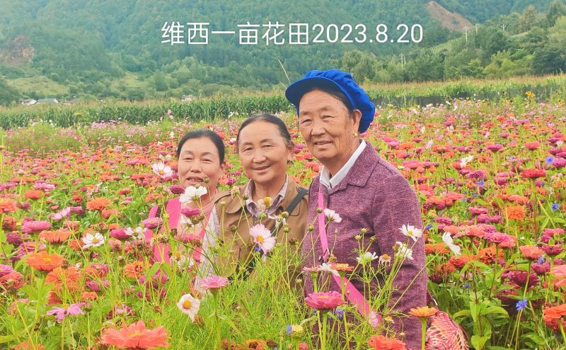 楊躍成把花卉基地起名為“一畝花田”,其實(shí)不止一畝。今年6月中旬開(kāi)始,各種花卉爭(zhēng)奇斗艷、競(jìng)相綻放。金燦燦的萬(wàn)壽菊、金雞菊、格桑花等匯成了花的海洋,成為永春鄉(xiāng)拖枝村的一道靚麗風(fēng)景線,每天都有維西縣城市民及周邊游客前來(lái)看花賞景,特別是周末游客絡(luò)繹不絕。