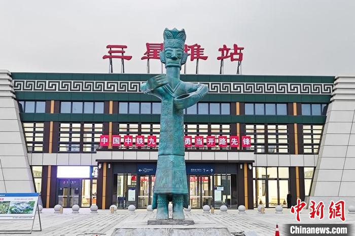 川青鐵路廣漢三星堆站廣場上豎立的青銅立人像。劉忠俊 攝