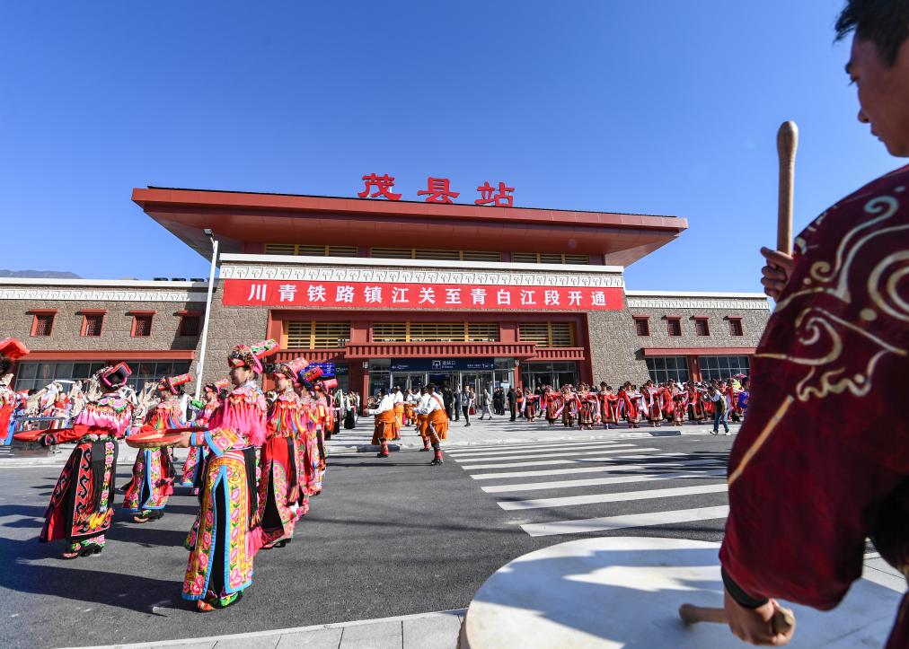 11月28日,在川青鐵路茂縣站,當(dāng)?shù)馗髯迦罕娫谡厩皬V場慶祝鐵路開通運(yùn)營。 新華社記者 王曦 攝