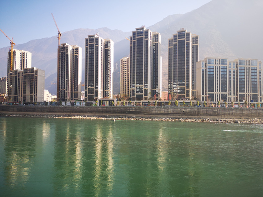 瀘定縣新城“艾威·春之陽光城”工地,3幢大樓已封頂,“第四代現(xiàn)代住宅垂直森林生態(tài)宜居”的概念吸人眼球。
