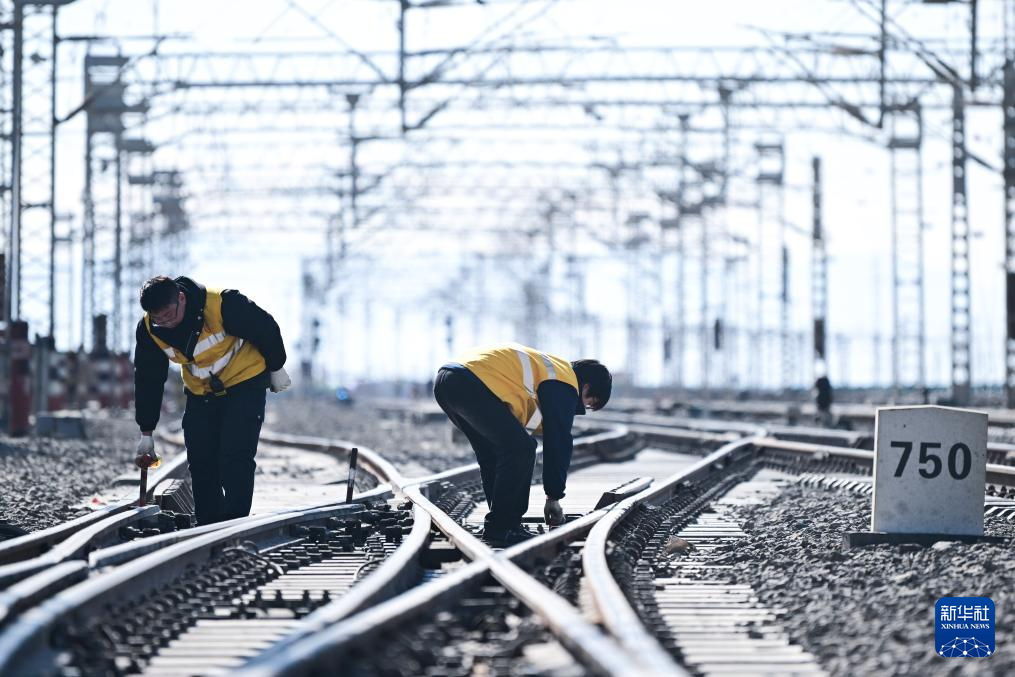 1月29日,格爾木電務(wù)段格爾木東信號(hào)車間察爾汗信號(hào)工區(qū)職工楊正宏(左)和胡進(jìn)海在對(duì)察爾汗站道岔進(jìn)行檢修作業(yè)。新華社記者 張龍 攝