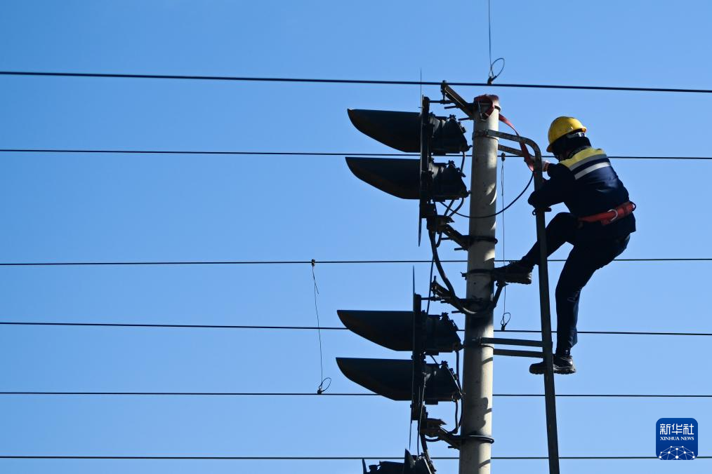 1月29日,格爾木電務(wù)段格爾木東信號(hào)車間察爾汗信號(hào)工區(qū)職工何江東在高柱信號(hào)機(jī)上檢查信號(hào)機(jī)安裝螺絲是否緊固。新華社記者 張龍 攝