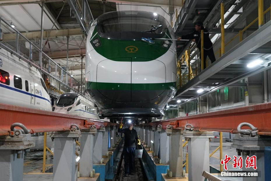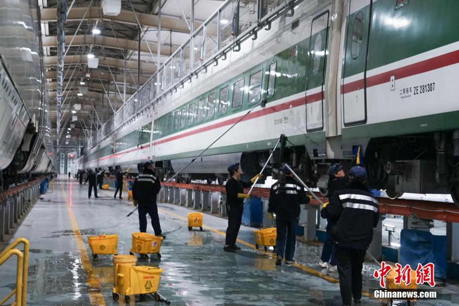 1月30日晚,在青藏鐵路公司西寧車輛段動(dòng)車運(yùn)用車間,工作人員在無電作業(yè)時(shí)進(jìn)行動(dòng)車清潔。中新社記者 馬銘言 攝