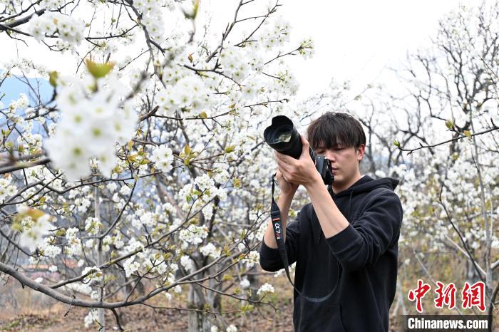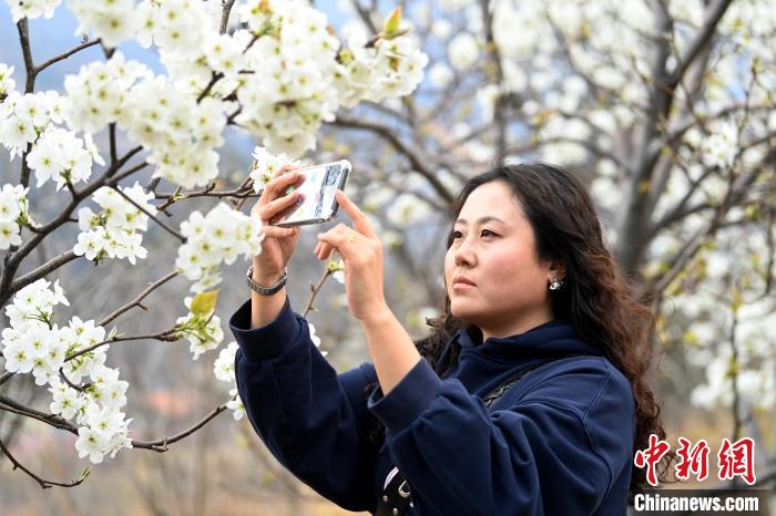 游客在拍攝梨花。記者 安源 攝