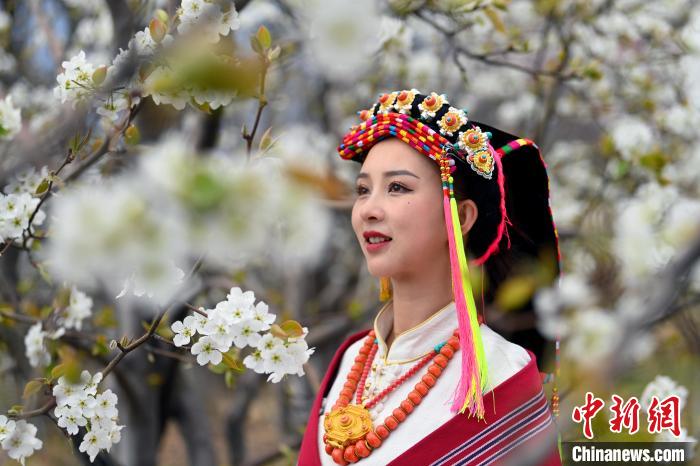 藏族姑娘在梨花林里拍照。記者 安源 攝