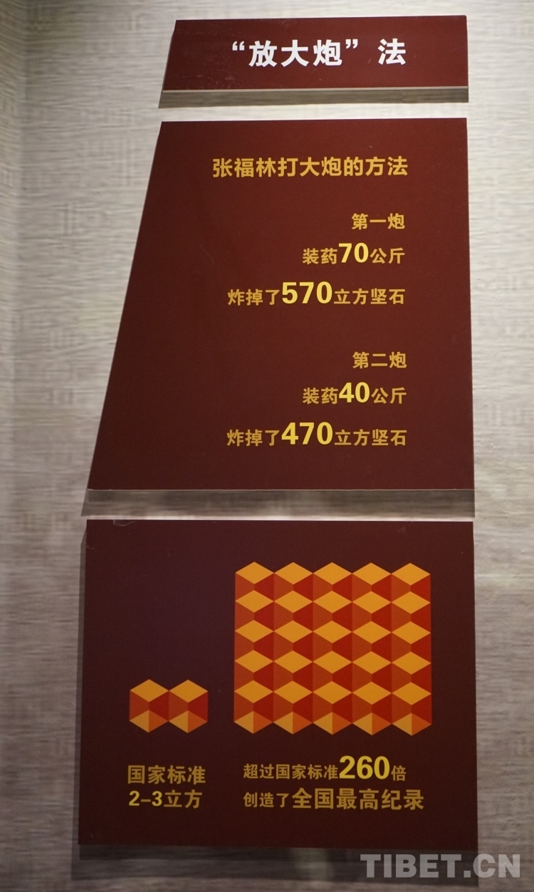 在雀兒山修路時,張福林白天與戰(zhàn)友們懸在巖壁上打炮眼,晚上到工地上研究堅石、孤石、松石、片石等各種石頭的打眼、裝藥、放炮等技術(shù),并積極向工程人員、技工同志、工兵部隊學(xué)習(xí),最終提出了改進裝藥的方法,即“放大炮法”。“放大炮法”的爆破功效超國家標準260倍,創(chuàng)造了全國爆破的最高紀錄。這一方法不僅能提高工效,還能節(jié)約炸藥,在筑路部隊中得到全線推廣,張福林也被大家譽為“大炮手”。