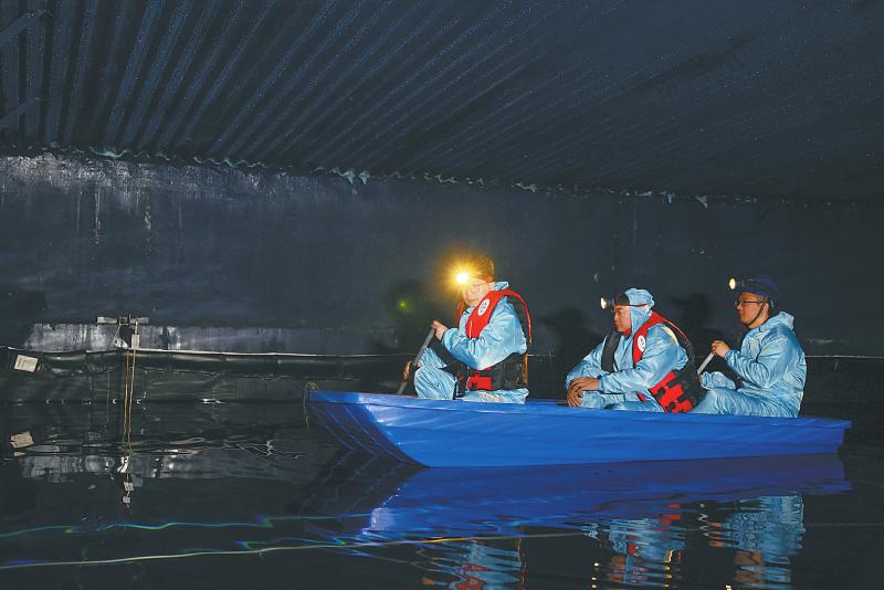 劃著小船進(jìn)入探測(cè)器內(nèi)部,體感溫度逐漸降低,這里的濕度超過(guò)90%,水溫接近零攝氏度。通過(guò)手電筒射出的光柱,隱約看得見(jiàn)大家呼出的白氣,燈光照射之外的區(qū)域就是極致的黑暗。