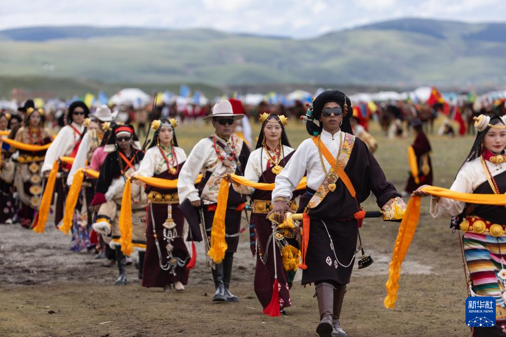 7月30日,在理塘縣多旺塘賽馬場,來自理塘縣高城鎮(zhèn)的方隊展示傳統(tǒng)民族服飾。新華社記者 江宏景 攝