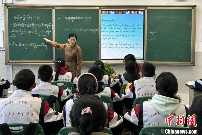 近日,色達縣中學(xué)東校區(qū),學(xué)生們在上藏文課。中新社記者 王鵬 攝