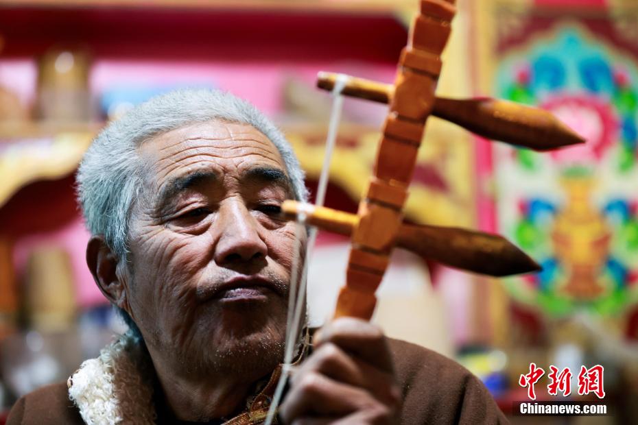 12月21日,四川巴塘,王扎西(右)在自家院中彈奏弦胡。中新社記者 薛蒂 攝