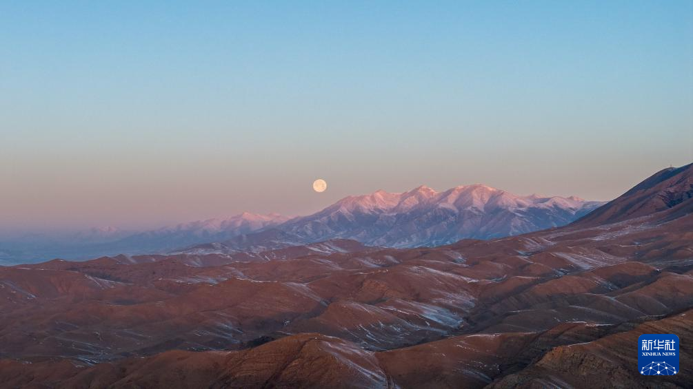 這是1月14日在新烏鞘嶺隧道附近拍攝的山脈與月亮(無(wú)人機(jī)照片)。新華社記者 郎兵兵 攝