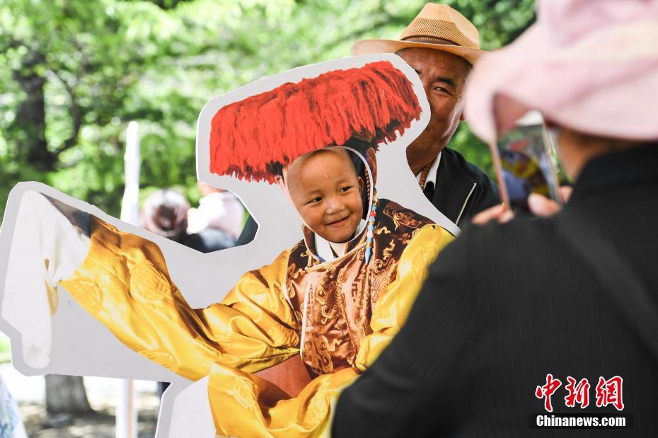 5月25日,2019年“藏戲演出季”第二場(chǎng)演出在西藏拉薩布達(dá)拉宮腳下的宗角祿康公園開演。據(jù)了解,2019年藏戲演出季將持續(xù)到今年的7月20日,每周六來自拉薩八縣區(qū)的優(yōu)秀藏戲隊(duì)將相繼進(jìn)行公益表演。圖為當(dāng)?shù)貎和w驗(yàn)藏戲人物裝扮造型。中新社記者 何蓬磊 攝