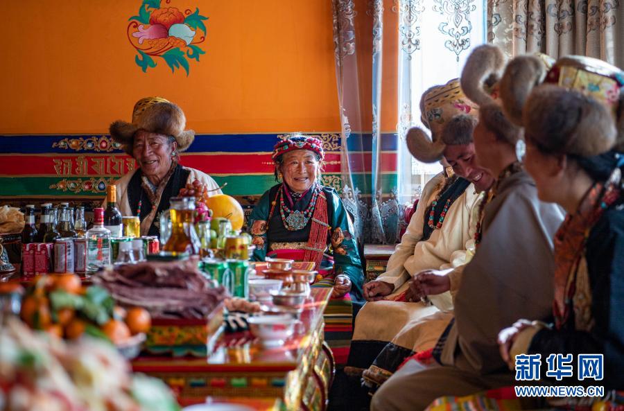 1月14日,在位于嘎吉林村安置點(diǎn)的新家中,村民們身著盛裝共度日喀則藏歷農(nóng)家新年。新華社記者 孫非 攝