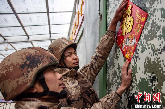 保溫方艙內(nèi),該旅官兵正在用“福”字精心點(diǎn)綴裝飾。 王述東 攝