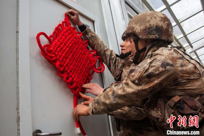 該旅官兵正在用中國(guó)結(jié)點(diǎn)綴裝飾保溫方艙?!⊥跏鰱| 攝