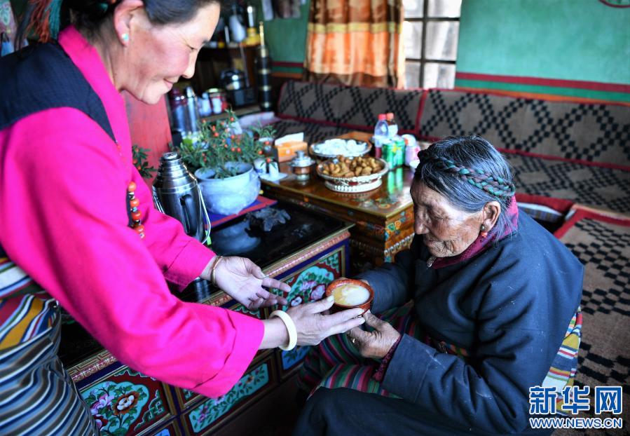 女兒給巴桑獻酥油茶(2月27日攝)。新華社記者 孫非 攝