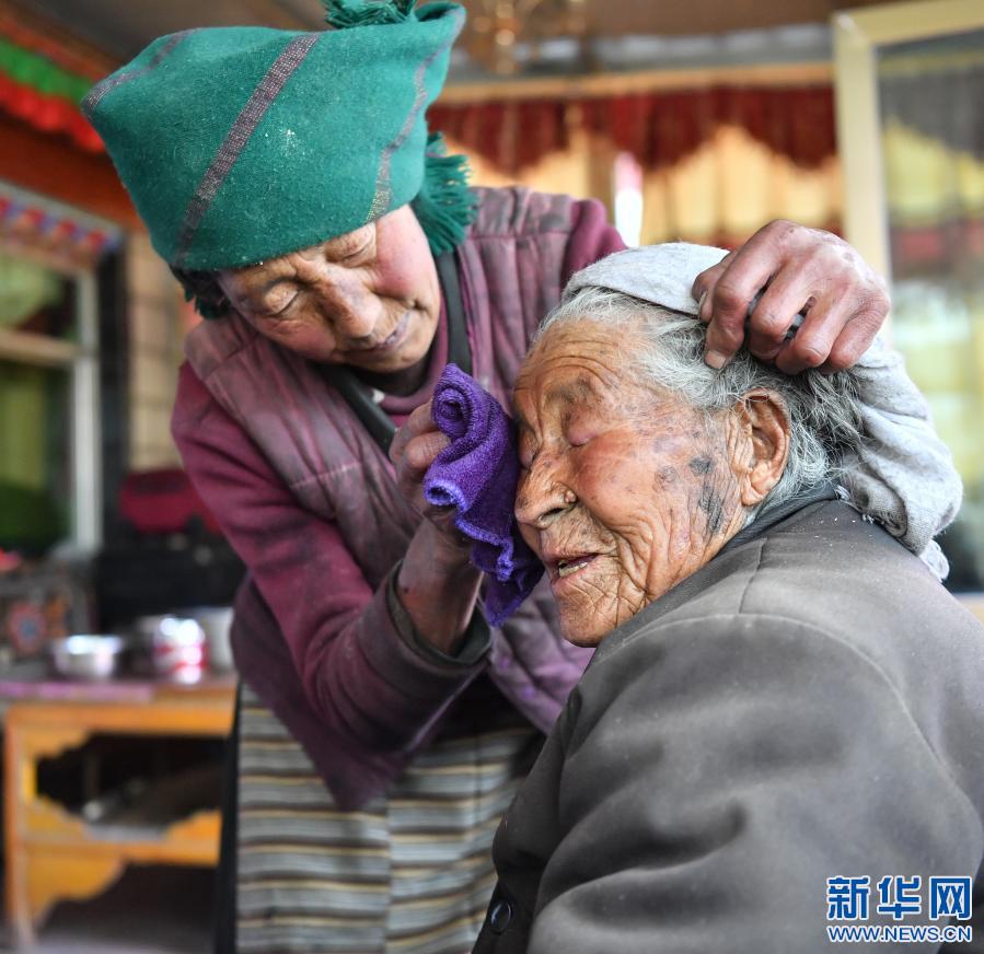 卓嘎的女兒幫她洗臉(3月22日攝)。新華社記者 晉美多吉 攝
