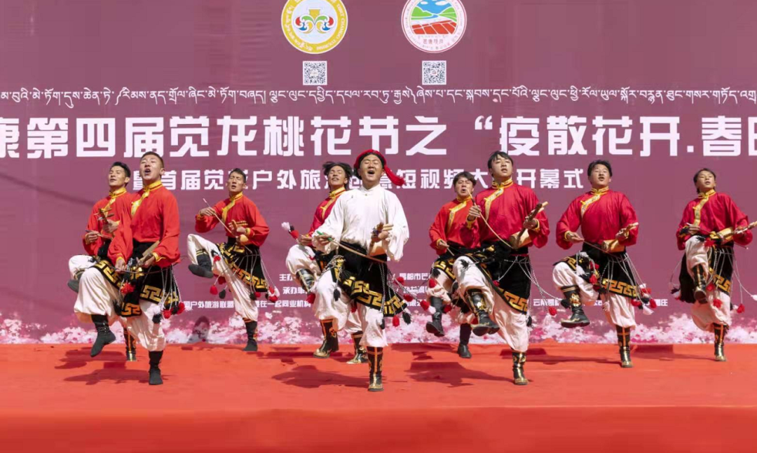 4月3日活動正式開幕,開幕式上,昌都市人大常委會主任、黨組書記,芒康縣委書記齊應海宣布活動開幕,并為納西民族鄉(xiāng)覺龍村頒授了《全國鄉(xiāng)村旅游重點村》獎牌。昌都市旅游發(fā)展局副局長蔡慶,芒康縣委常委、常務副縣長杜晨光出席開幕式并致辭。麗江藝術團和芒康藝術團帶來的歌舞《吉祥謠》《福滿昌都》《崗拉梅朵》等精彩紛呈的表演為在場觀眾帶來了一場歌舞盛宴。開幕式后,游客們循著山谷中遍野的桃花,漫步山野田間,記錄著每一個美麗的瞬間。出了覺龍溝,大家在扎古西大峽谷參觀了文成公主廟和崗達寺,傍晚在云曲莊園大家圍著篝火跳起了歡快的舞蹈。
