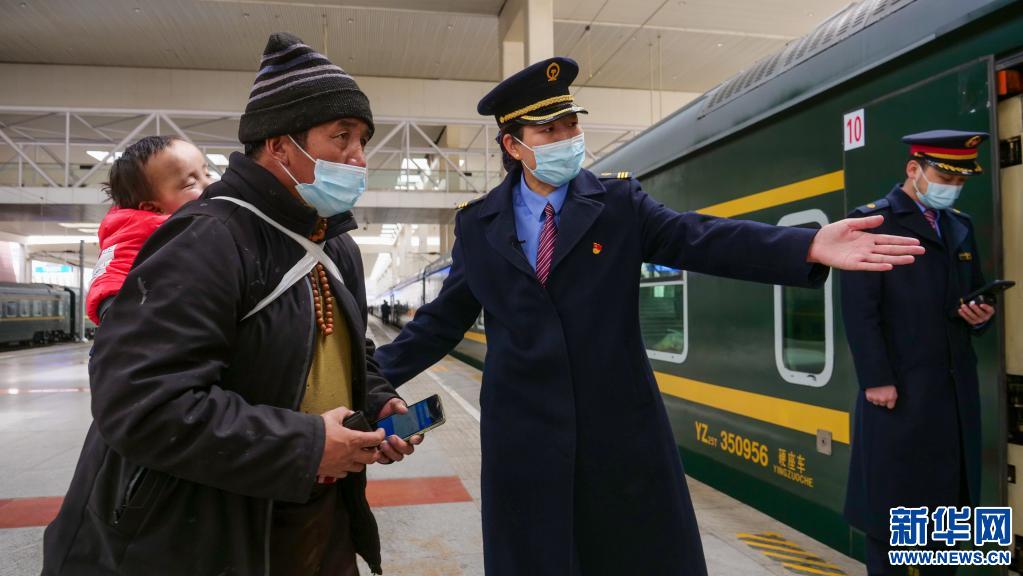 斯朗卓瑪(中)在拉薩火車站引導(dǎo)乘客上車(3月22日攝)。新華社記者 旦增尼瑪曲珠 攝
