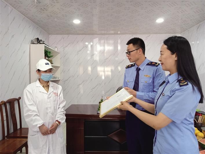 工作人員向商家負責人發(fā)放登記證。