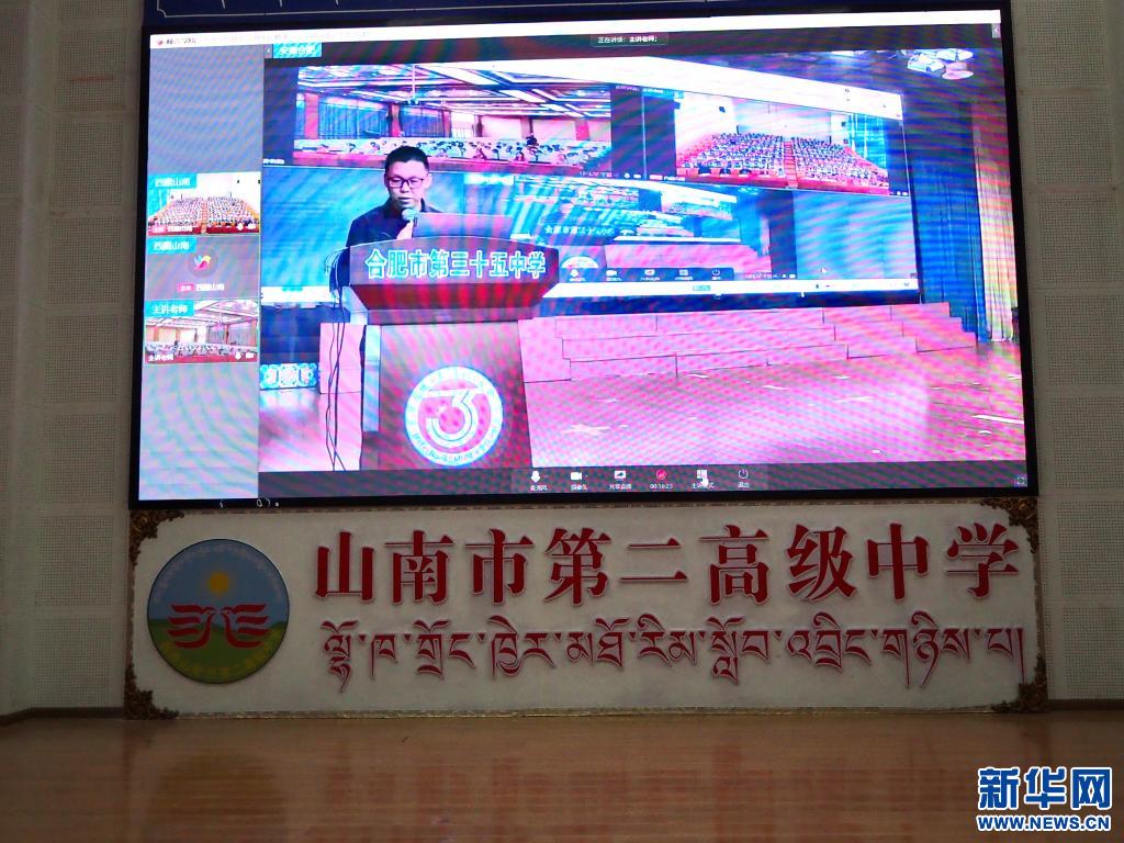 西藏山南市第二高級中學(xué)的學(xué)生坐在階梯教室中,屏幕的另一端是安徽省合肥市第三十五中學(xué)的同學(xué)們。借助網(wǎng)絡(luò)傳輸技術(shù),皖藏兩地實(shí)現(xiàn)思政課教學(xué)資源跨越上千公里的互聯(lián)共享,創(chuàng)新了思政課的形式。