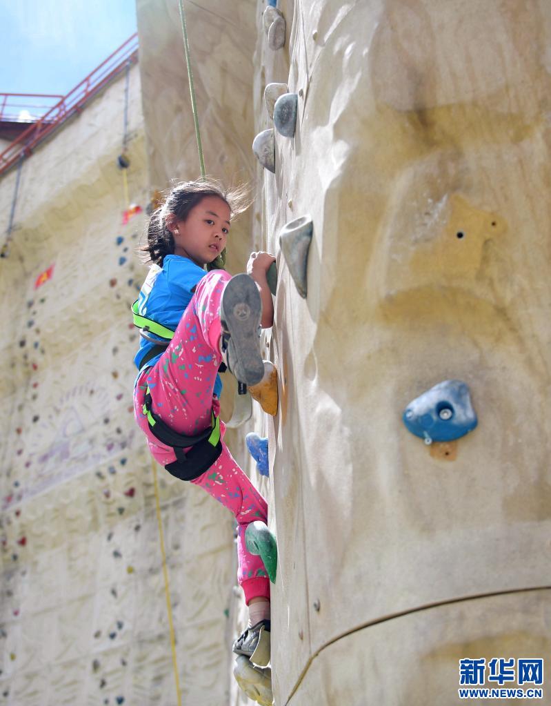 2017年5月,全運(yùn)會(huì)群眾性項(xiàng)目西藏攀巖資格賽在拉薩舉行,圖為少年組小選手丹喬央宗在攀爬。新華社記者 晉美多吉 攝