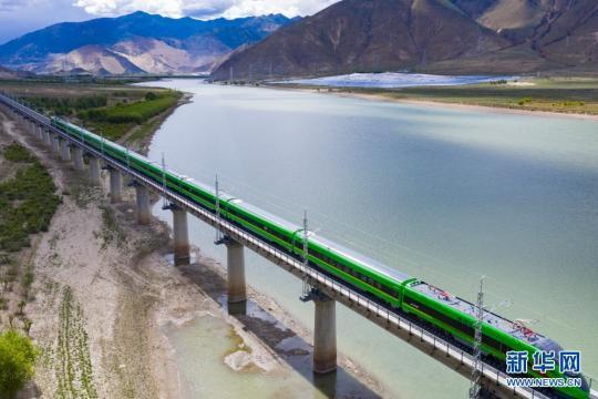 試運行的復興號列車行駛在雅魯藏布江上(6月16日攝,無人機照片)。新華社記者 普布扎西 攝
