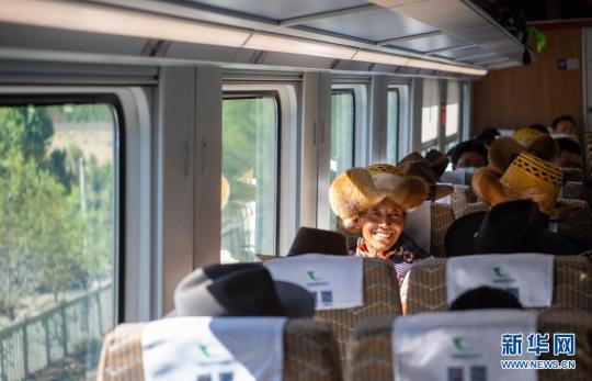 來自山南市貢嘎縣杰德秀鎮(zhèn)杰德秀村的巴珠,今年68歲,他一會兒從車窗眼望高山峽谷,一會兒摸摸車內(nèi)現(xiàn)代化設施,這是他頭一次坐火車?!皬团d號和牛車比起來,像是在飛翔?!彼χf。