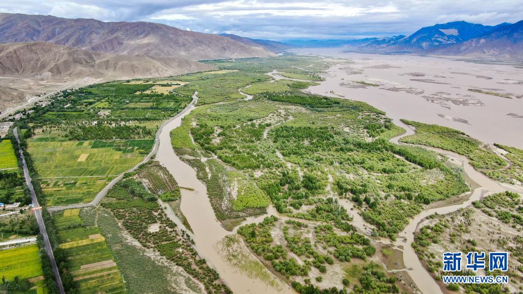 雅魯藏布江山南段沙丘上的人工林(7月20日攝,無人機照片)。新華社記者 晉美多吉 攝