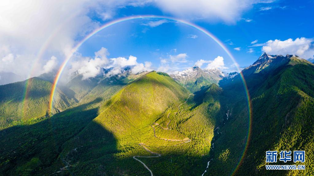 這是7月6日拍攝的米林縣派鎮(zhèn)至墨脫公路上的彩虹(無(wú)人機(jī)照片)。新華社發(fā)(董志雄 攝)