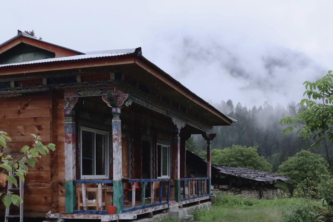 從蜿蜒的小路向前行進(jìn),穿過(guò)一片幽靜的綠林,循著淙淙溪水聲繼續(xù)往前,首先映入眼簾的是一塊寫著“波波李花園酒店——西藏林芝美術(shù)攝影創(chuàng)作基地”的牌子,這里就是巴卡村黨支部書記尼瑪次仁的家。