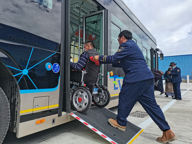 3日,拉薩市公交運營有限公司舉行拉薩公交經(jīng)開區(qū)B區(qū)公交首末站啟用暨大站快線開通儀式。現(xiàn)場,坐在輪椅上的市民覺列準備乘坐新公交車,駕駛員接到乘車提示后,采取制動措施,將車輛熄火后來到后門處,將無障礙踏板翻開并固定好,順利幫其上車。