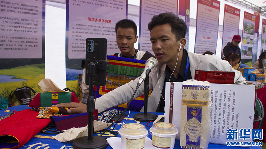 圖為在農(nóng)產(chǎn)品展銷區(qū)直播帶貨的展銷人員(9月23日攝)。新華網(wǎng) 達(dá)次 攝