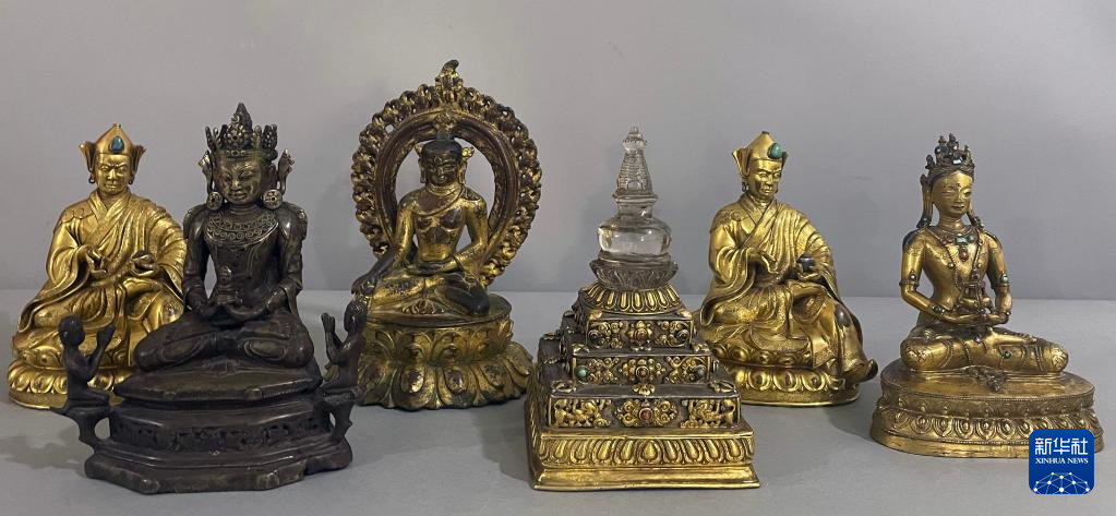 經(jīng)過鑒定研究,專家認為該批文物藝術品年代跨度主要為明清至民國時期,珍貴文物6件,一般文物2件,藝術品4件,總體上為我國西南地區(qū)典型器物,具有比較重要的歷史、藝術、科學價值。其中,5件金銅佛造像和1件銅鎏金水晶嵌寶石供養(yǎng)塔制作工藝精良,專家建議暫定為三級文物。特別是1尊明末清初的黃銅同侍從無量壽佛造像,呈現(xiàn)出顯著漢藏融合風格,其六面形臺座多見于漢藏風格唐卡與壁畫,在銅造像中較為罕見。