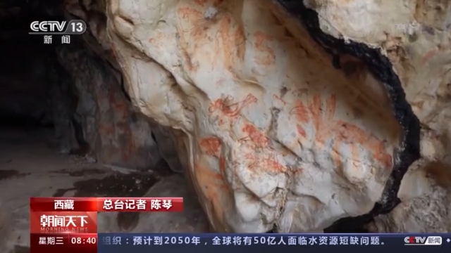 總臺(tái)記者 陳琴:現(xiàn)在我們就來到納木錯(cuò)環(huán)湖科考巖畫調(diào)查點(diǎn)的1號(hào)點(diǎn),您看到這個(gè)巖畫是由紅色的赭石這個(gè)顏料做成的,看起來特別像一只可愛的小鳥。