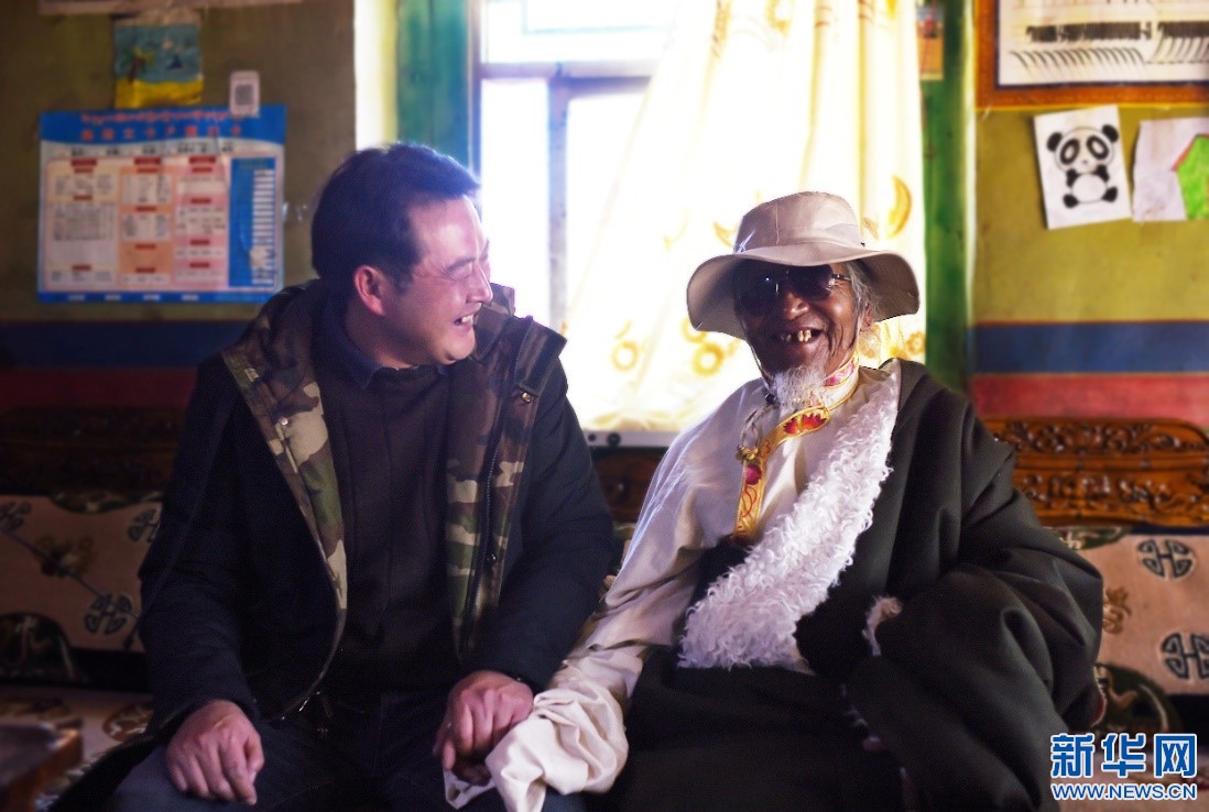 10月30日,邱學彥在跟村民扎塔老人聊天。新華網(wǎng) 旦增努布 攝