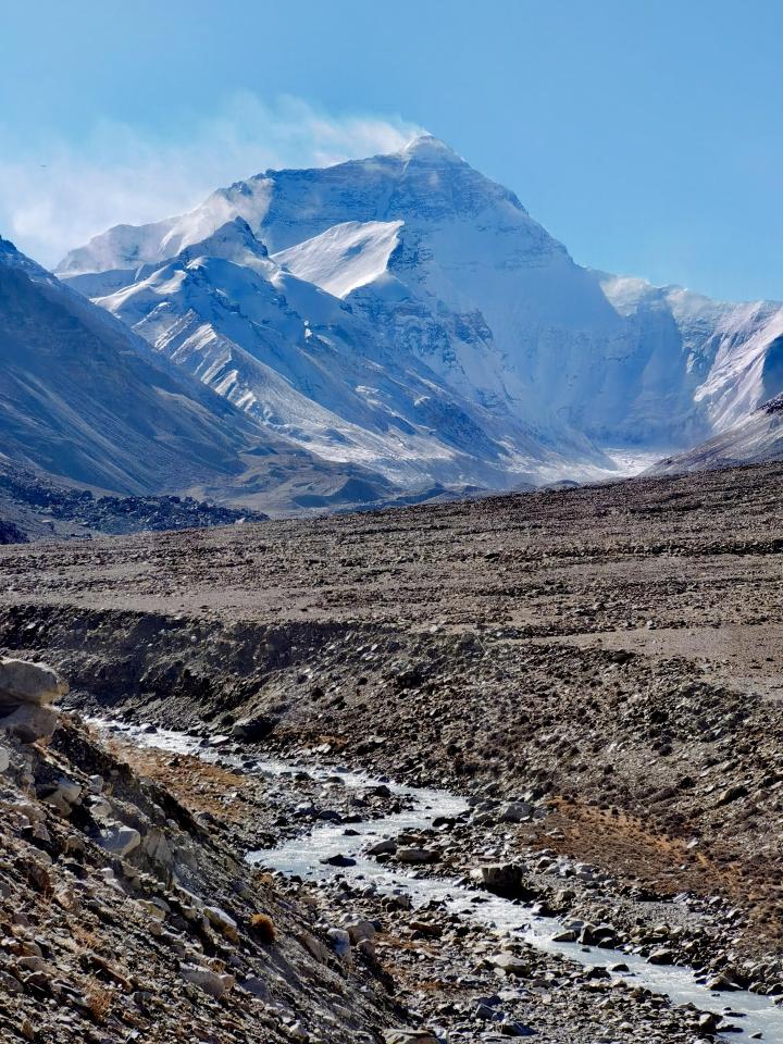 車行約20分鐘后,到達(dá)游客大本營(yíng)。這里是游客在珠穆朗瑪峰國(guó)家級(jí)自然保護(hù)區(qū)內(nèi)可以到達(dá)的距離珠峰最近的位置。面向海拔8848.86米的珠峰,發(fā)源于絨布冰川末端的扎嘎曲在游客大本營(yíng)右邊流過(guò)。