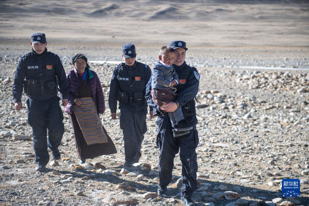 普瑪江塘邊境派出所的移民管理警察幫助牧民旦增多杰的家人離開困在冰河里的小貨車(11月20日攝)。新華社記者 孫瑞博 攝