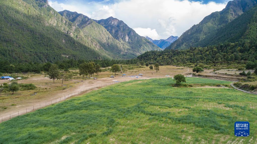 西藏林芝市米林縣,“綠哈達(dá)行動(dòng)”中種植的人工草場(chǎng)郁郁蔥蔥(2020年9月13日攝,無(wú)人機(jī)照片)。 新華社記者孫非 攝
