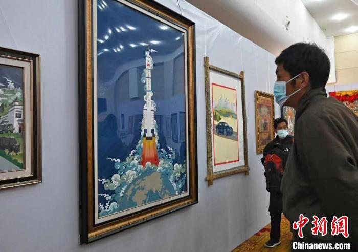 邊巴是作品《一飛沖天》的作者,這位畫師從1979年從事唐卡繪畫至今。他說,該作品以神舟十三號(hào)為主題,描繪了飛船沖出地球奔向星辰大海的瞬間。采用勉唐派唐卡繪畫語(yǔ)言和傳統(tǒng)礦植物顏料。同時(shí)融合了漢藏審美視角,立足于中國(guó)放眼世界的人類命運(yùn)共同體胸懷,嘗試新時(shí)代新唐卡新融合的藝術(shù)表達(dá)。
