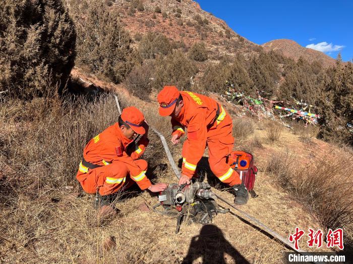 圖為消防指戰(zhàn)員架設(shè)水源地。江達(dá)縣森林消防中隊(duì)貢覺駐防分隊(duì) 供圖