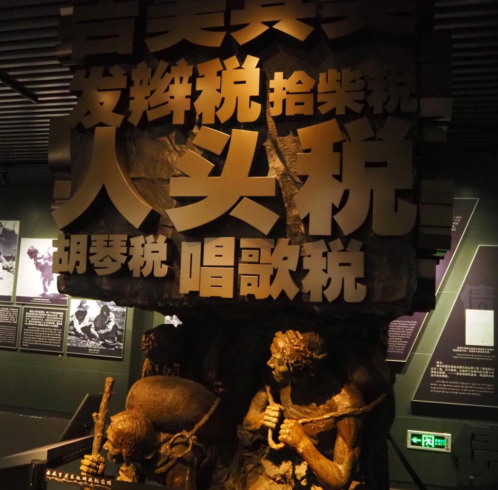 這座占地2700平方米的展館里,陳列著反映舊西藏苛捐雜稅的雕像,也陳列著舊時農(nóng)奴被囚禁虐待的慘狀。