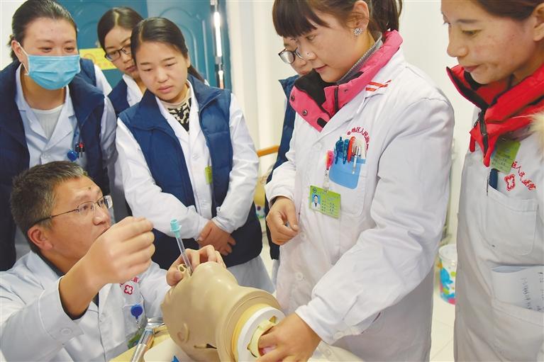 圖為西藏自治區(qū)那曲市人民醫(yī)院援藏專家手把手向醫(yī)務人員傳授“氣管插管術”動作要領。記者 次仁片多 攝