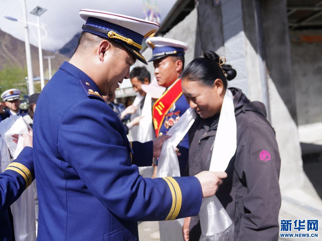 西藏林芝市森林消防支隊支隊長楊飛向洛桑頓珠家屬敬獻哈達(4月15日攝)。(李國燾攝 新華網(wǎng)發(fā))