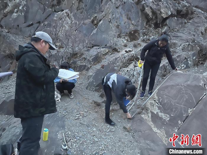 圖為日喀則石刻藝術(shù)博物館工作人員測(cè)量巖畫尺寸。日喀則石刻藝術(shù)博物館供圖
